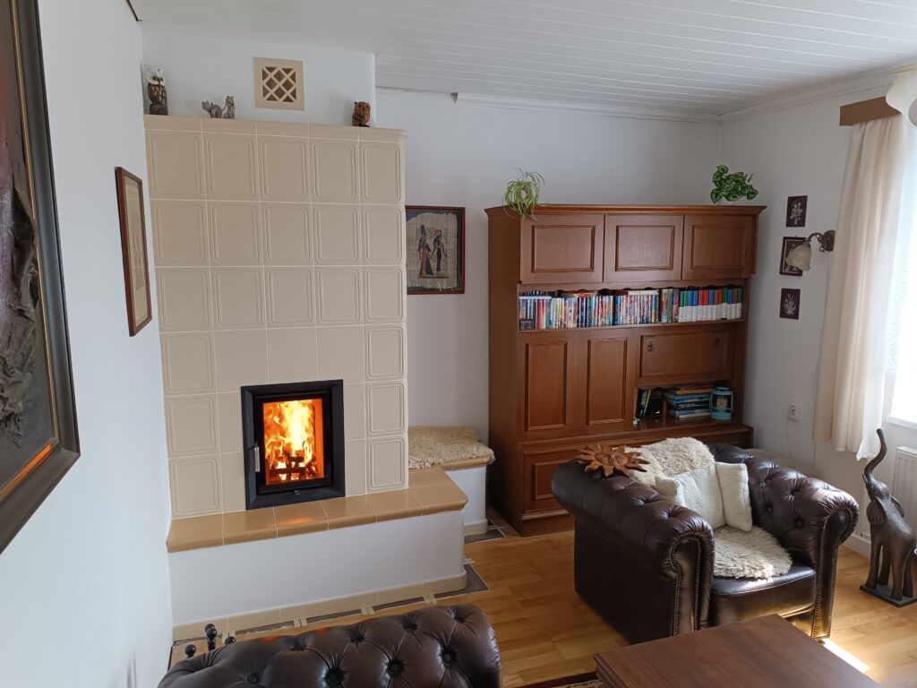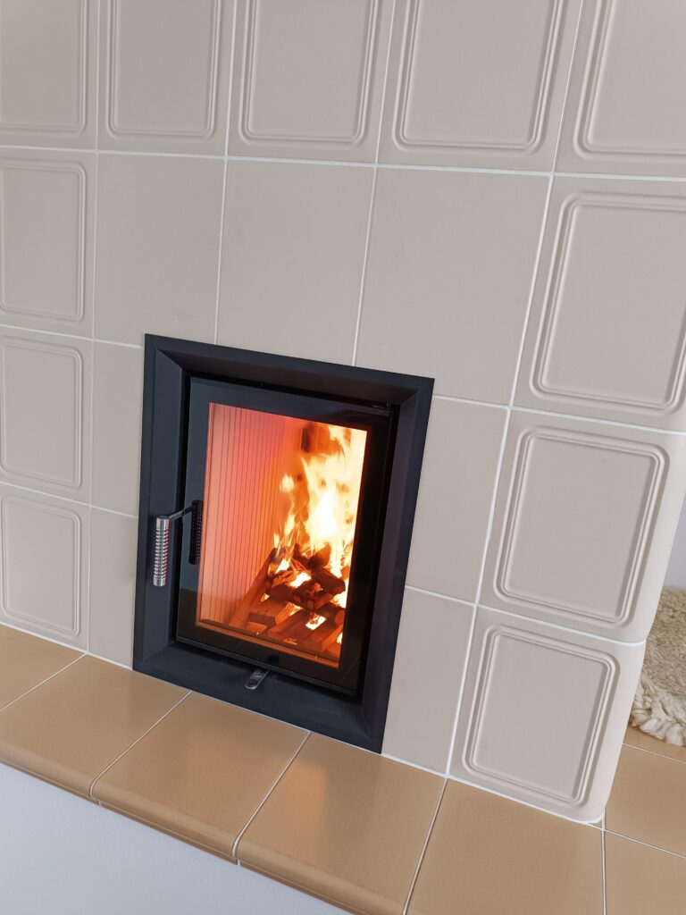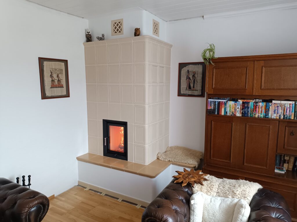 Stavba akumulačního krbu se sálavým kachlovým pláštěm. Srdcem krbu je krbová vložka od firmy Hoxter Haka 37/50 G s akumulační nástavbou. Kachloví od firmy Hein glazura slonová kost matná v kombinaci se Saharou.