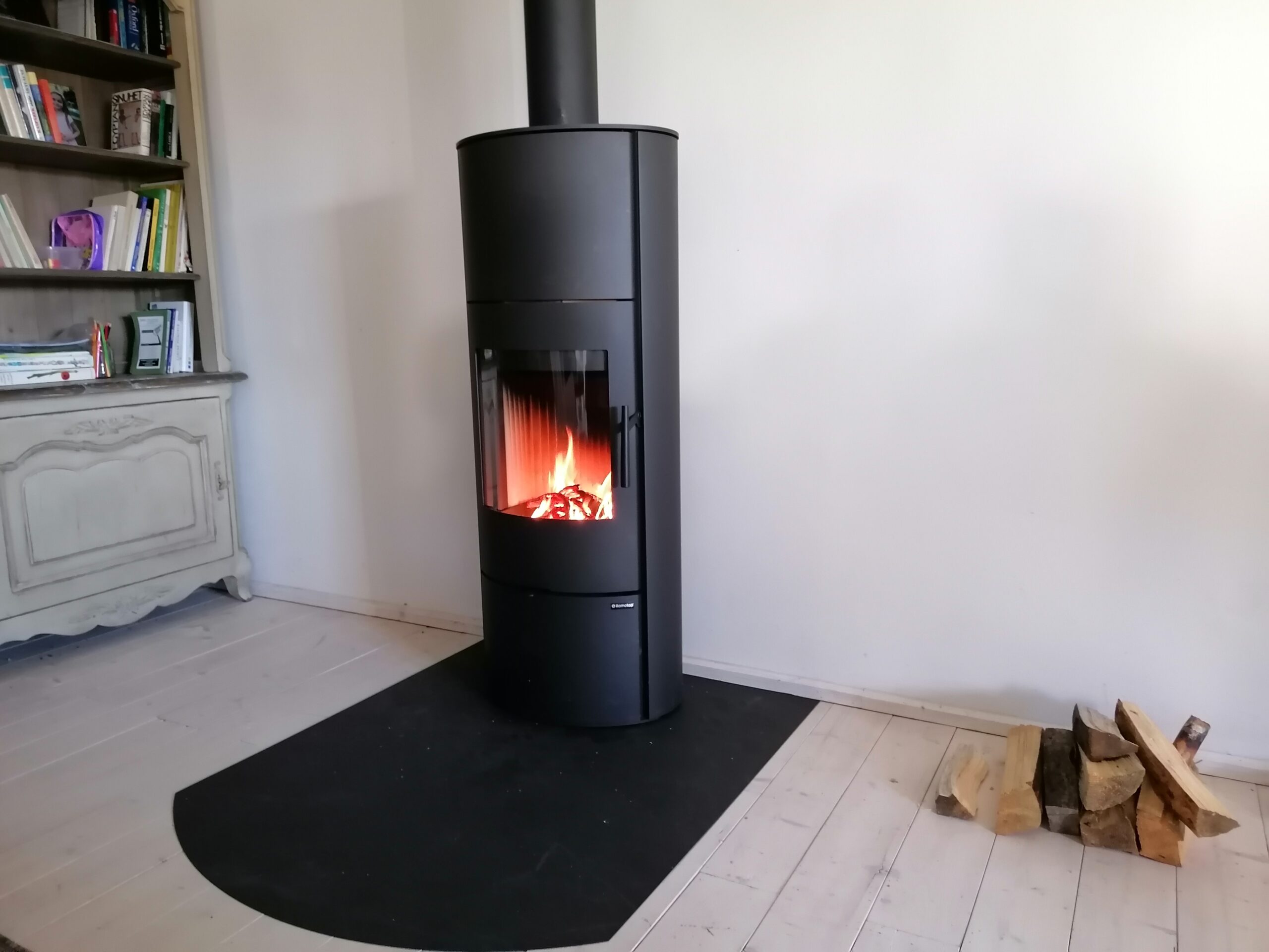 Hotová realizace krbu s krbovou vložkou Romotop HEAT C 3G L 80.52.31.01 s designovým ohýbaným sklem.